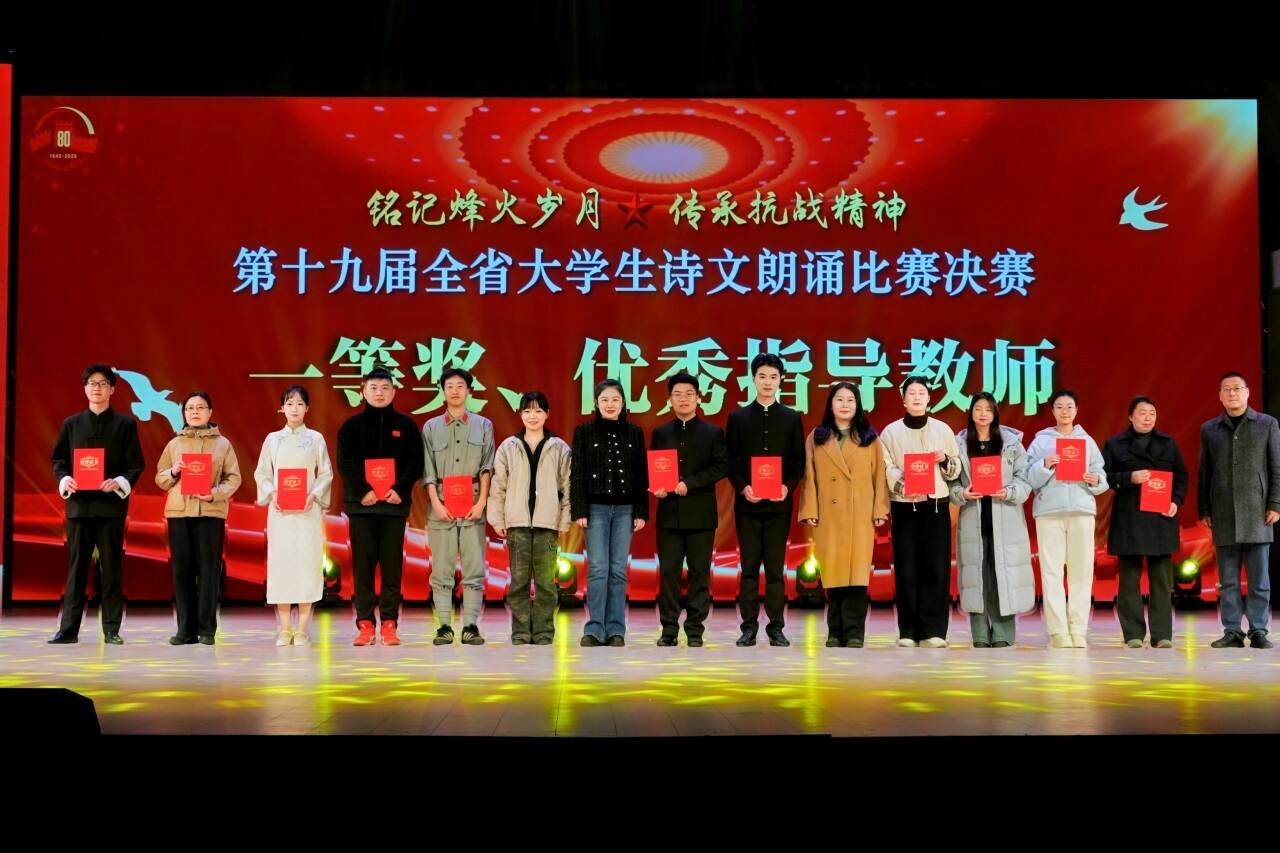 本届比赛正值抗战胜利80 周年重要节点,主题为“铭记烽火岁月,传承抗战精神”,旨在通过诵读深度诠释伟大抗战精神,铭记历史荣光,赓续民族精神血脉,致敬伟大胜利。全省高校共有59组非专业组选手和20组专业组选手入围决赛。在强手如林的决赛中,池州学院选手不惧挑战,以沉稳大气的台风、激情澎湃的诵读、真挚感人的演绎赢得了评委与观众的广泛好评,最终,文学与传媒学院选送的作品《雪落在中国的土地上》斩获非专业组一等奖(朗诵:高文靖),另一篇作品《土地的誓言》荣获专业组优秀奖(朗诵:潘琪、韩陈晨)。