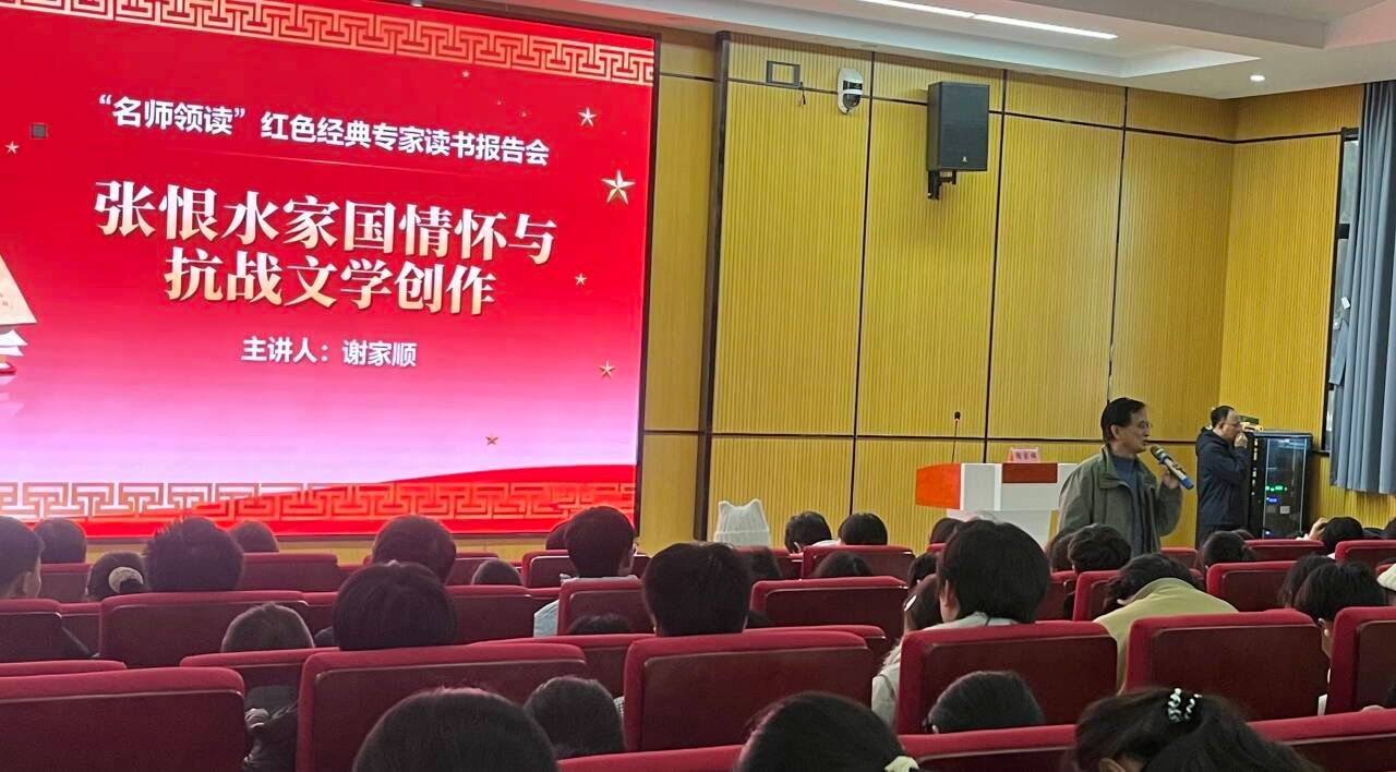 讲座中,谢家顺从张恨水少年时期双重性格的形成,跌宕起伏的人生经历,到抗战文学的重要旗手,以丰富的学识和独特的视角解读了《大江东去》《水浒新传》《虎贲万岁》《八十一梦》《弯弓集》等抗战文学作品的创作背景和文化内涵,带领师生感受其中蕴含的家国情怀和爱国为民、志存高远、勇担使命的精神品格。