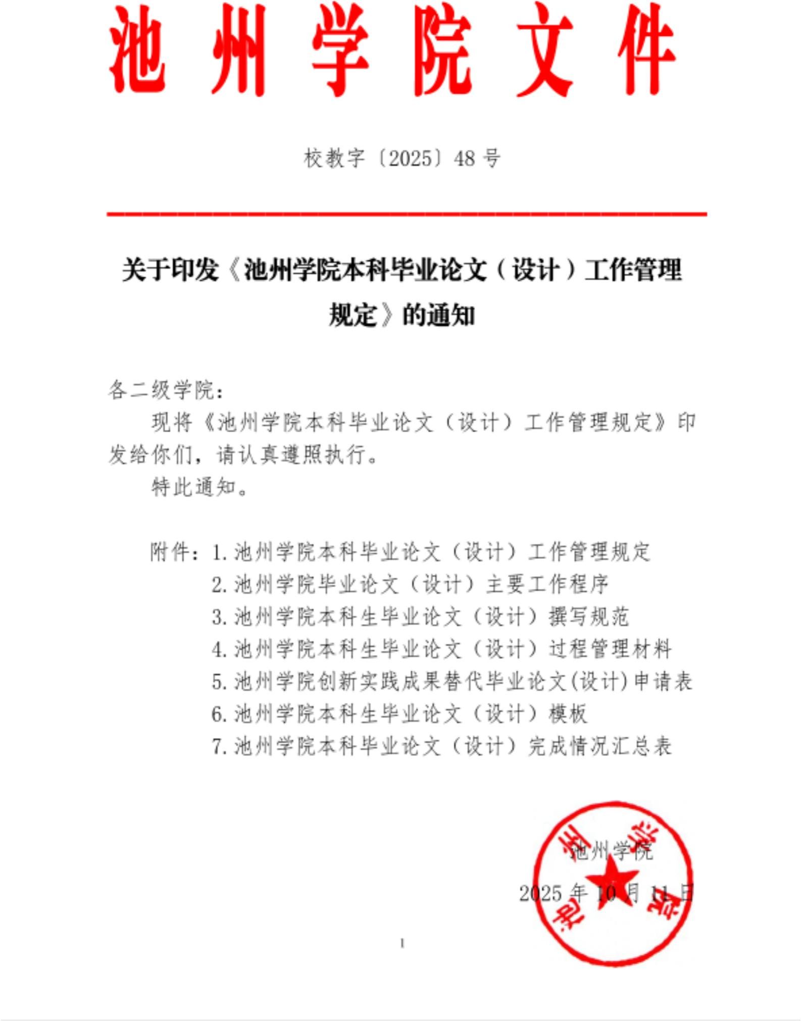 校教字〔2025〕48号:关于印发《池州学院本科毕业论文(设计)工作管理规定》的通知.pdf